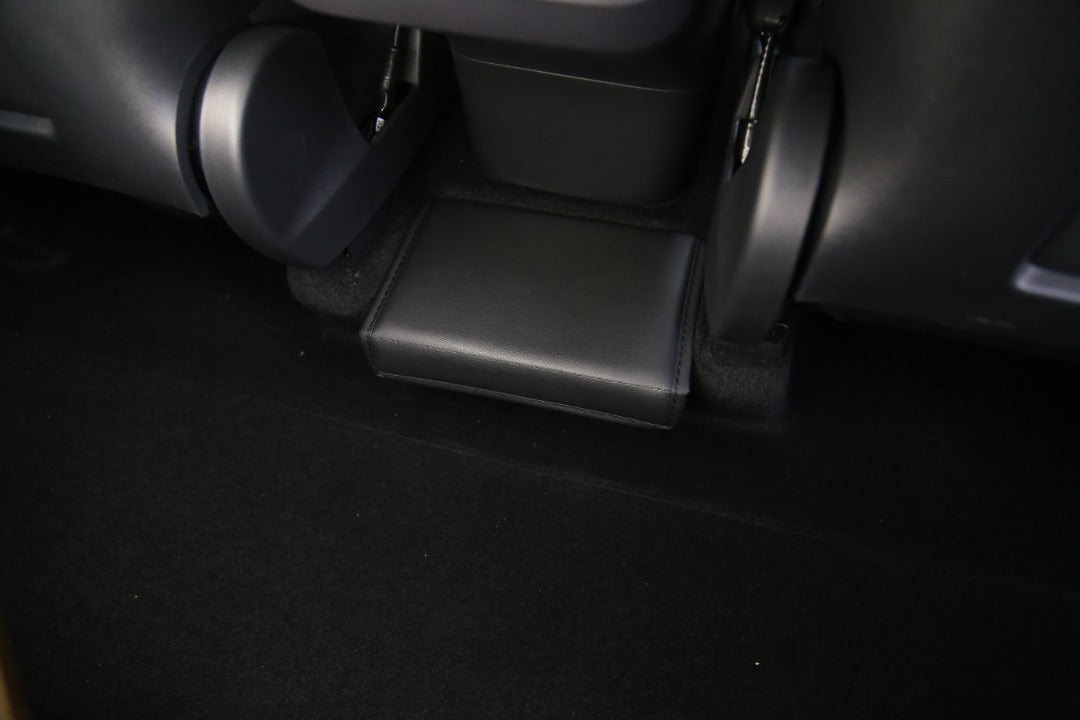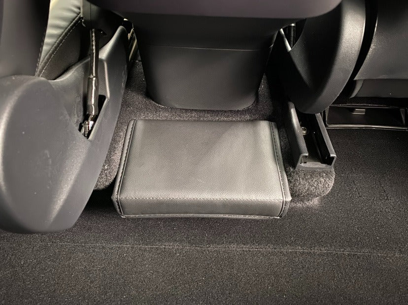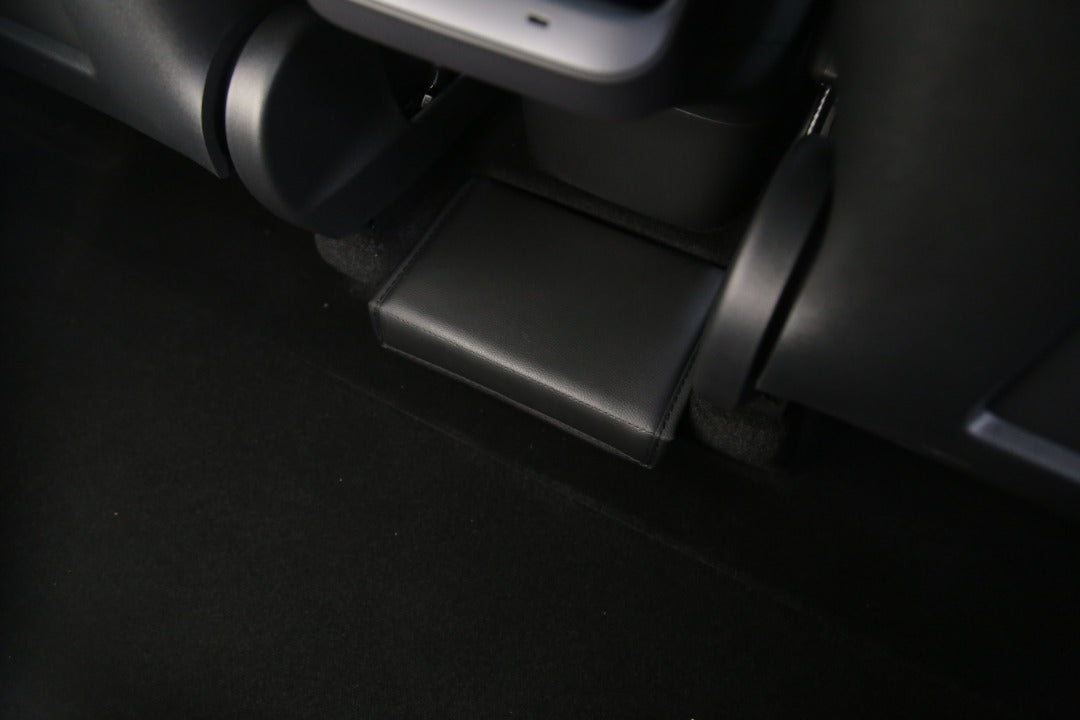 Model Y förvaring i baksätet bakom mittkonsolen i läder. Perfekt för snabb åtkomst och förvaring av snacks, skräp eller annat bra som behövs längst vägen. Varför inte förvara reflexväst eller annat viktigt som kan behövas om du blir ståendes längst vägen?